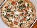 A creamy blend of ricotta, mozzarella, and Parmesan on a garlic-infused crust, topped with a touch of olive oil.